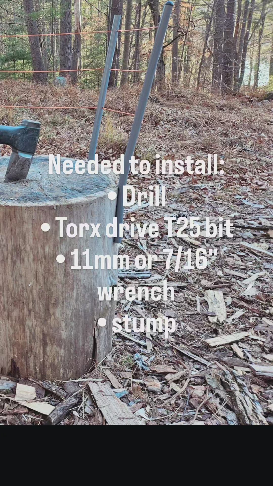 • Stump• Cordless drill• Torx drive T25 bit• 11mm or 7/16" wrench or socket